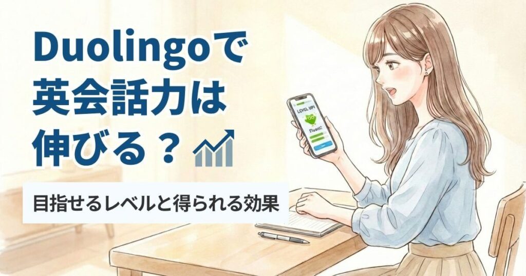 「Duolingoで本当に英語を話せるようになるの?」こんな疑問をお持ちではないですか?当記事では、到達できるスピーキングレベルと得られる効果について、筆者の実体験と実際の利用者10人から集めた口コミをもとに検証します。学習効果に懐疑的な方はぜひご覧ください。 -