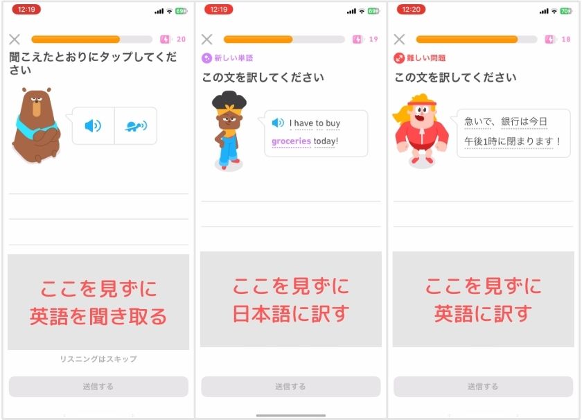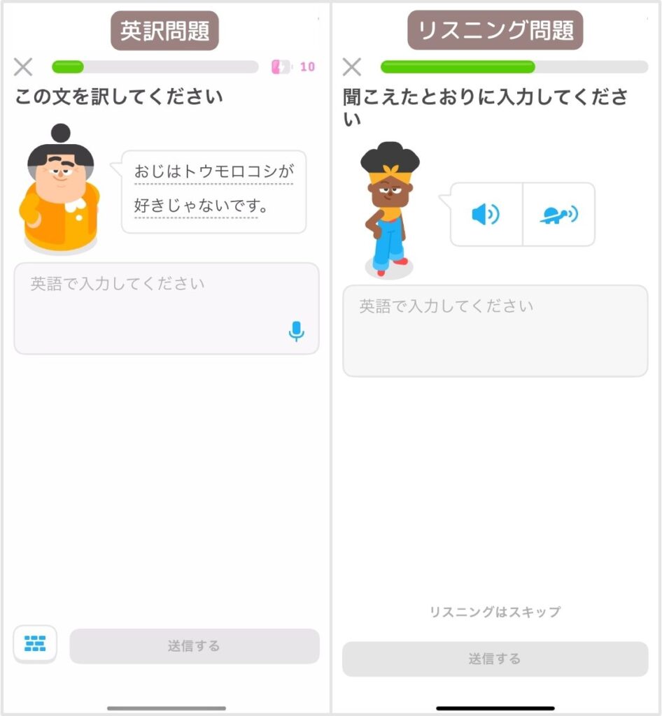 出題形式によって難易度に大きな差があるのは、Duolingoの特徴の1つですね。