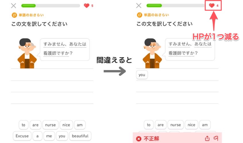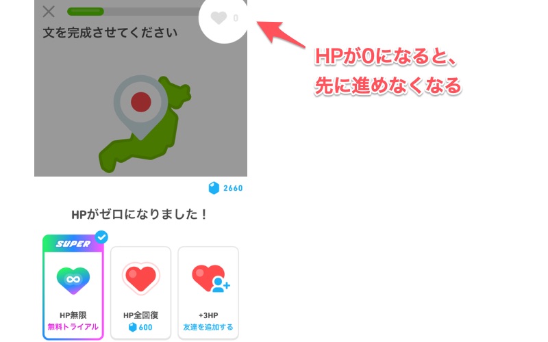 HP(ライフ)が無限で何回でもミスできる有料版に対して、無料版は5回まで。5回間違えるとHPが0となり、それ以降の問題にチャレンジできなくなります。