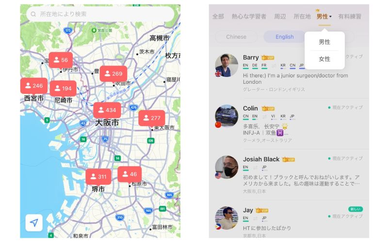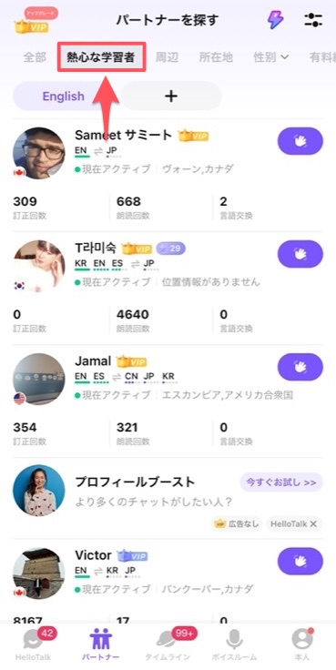 画面下メニュー「パートナー」から「熱心な学習者」をタップすると、真剣に日本語を学んでいるユーザーが表示されます。