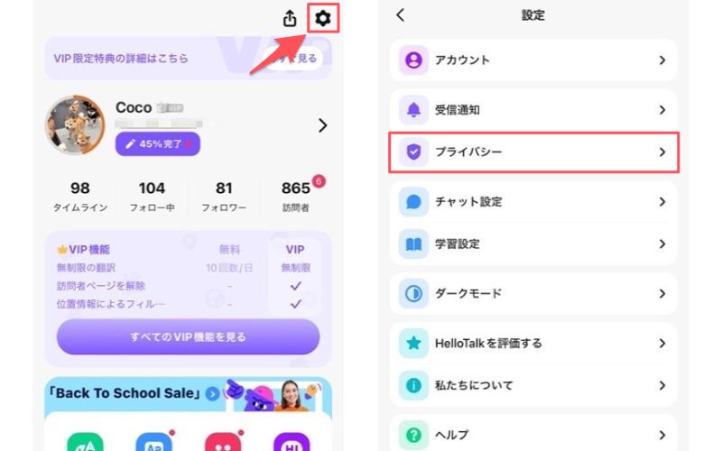 設定は画面下メニュー「本人」>「右上の設定アイコン」>「プライバシー」からできますよ。