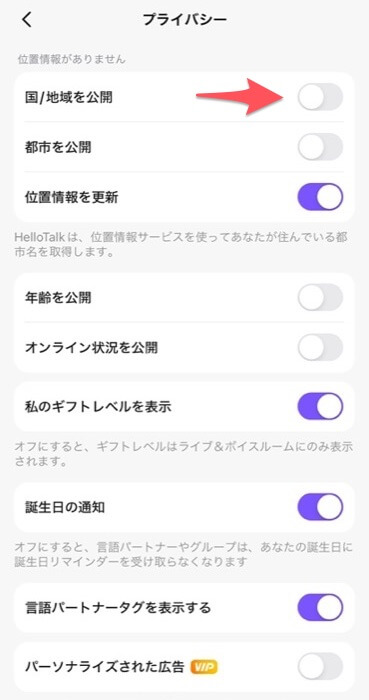 Hellotalkで知り合った人と直接会うつもりはない!という方はONにしておいた方が無難かなと。
