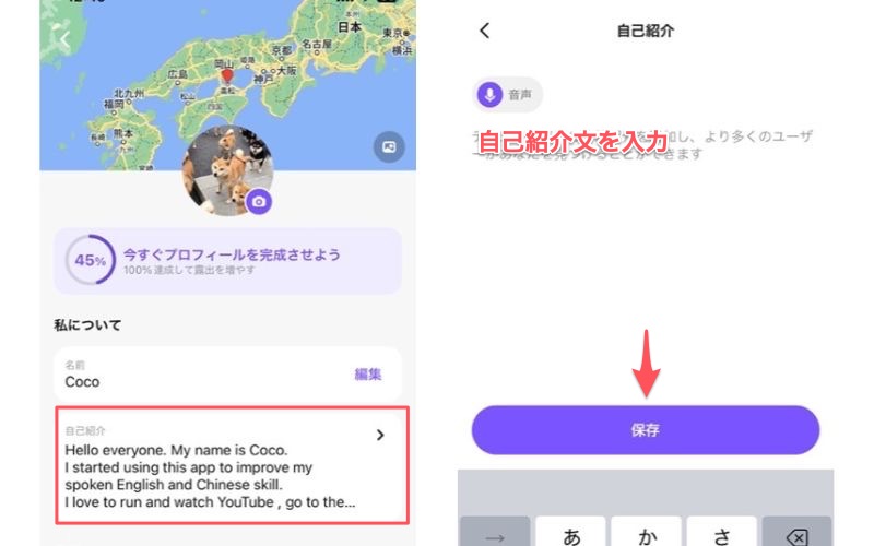 「自己紹介」をタップし、プロフィール文を入力。書き終えたら「保存」を押します。