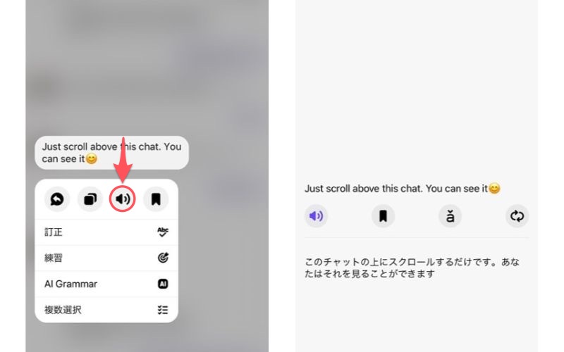 相手からのメッセージを読み上げてほしいときは、メッセージを長押しして「音声アイコン」をタップ。