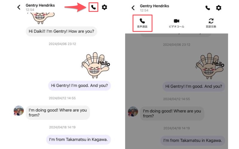 hellotalkでは5通以上メッセージのやりとりをすると、通話機能が使えるようになります。