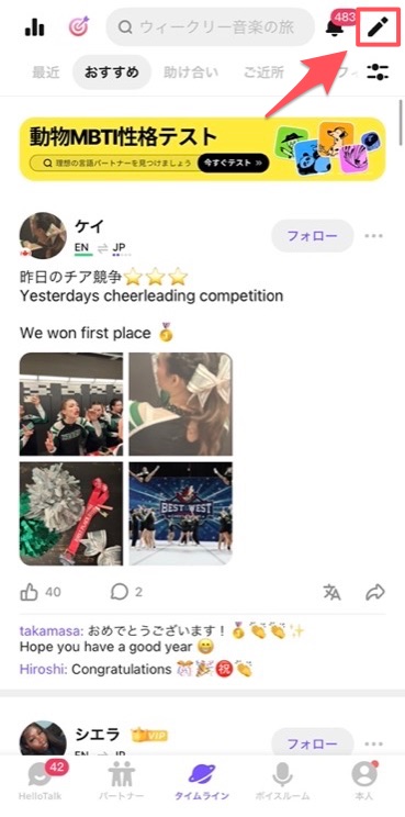 タイムライン画面の右上にある「鉛筆アイコン」をタップ。