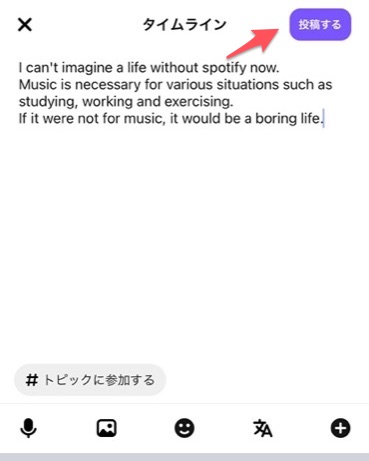 英文を入力し、右上の「投稿する」をタップすれば投稿完了です。