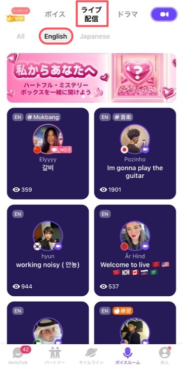 画面下メニュー「ボイスルーム」から「ライブ配信」をタップし、「English」を選択。