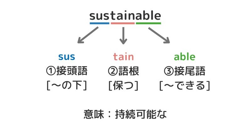 たいていの単語は①〜③の組み合わせからなるため、この3つのパーツの意味を知っていれば、同じパーツが使われた単語を芋づる式に覚えられますよ。