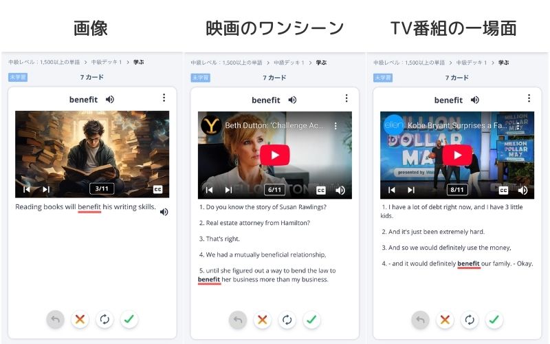 海外ドラマや映画のワンシーンで、その単語がどう使われているかを確認できるため、意味をひたすら頭に詰め込むより覚えやすいです。