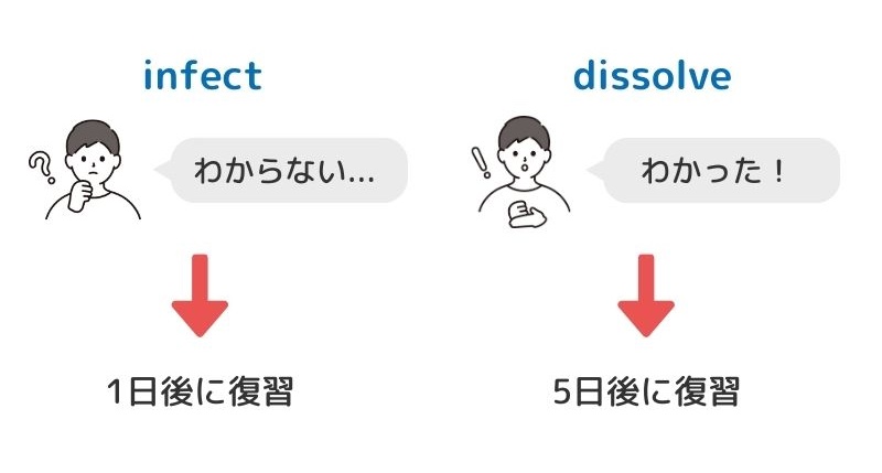 これは正解したから間隔をあけて5日後に復習ね。こっちは間違ったから1日後に復習してね。