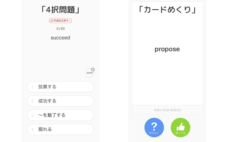 mikanは「4択クイズ・カード形式」でテンポよく英単語の意味を答えていくアプリ。
