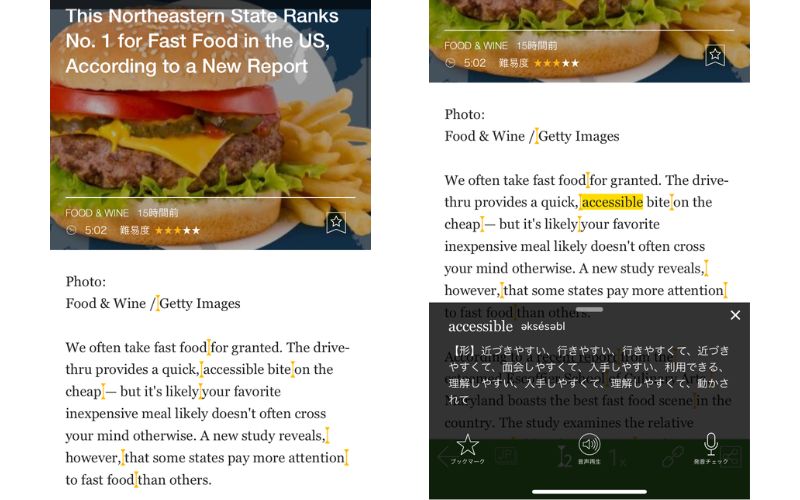 リーディングに役立つ機能(ワンタップ辞書など)も豊富なので、効率よく語彙力・読解力を磨けますよ。