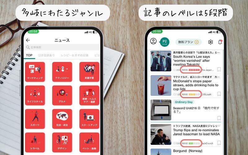 記事の難易度は5段階に分かれており、自分にとってちょうどいいレベルの記事を選ぶことが可能。