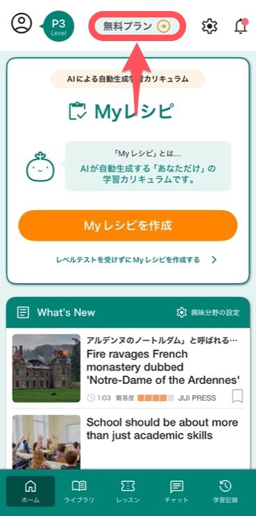 ホーム画面が表示されたら、画面上部の「無料プラン」をタップ。