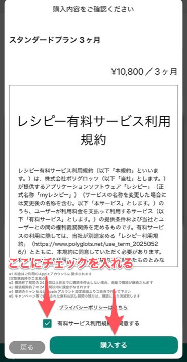 「有料サービス利用規約に同意する」にチェックを入れ、「購入する」をタップ。