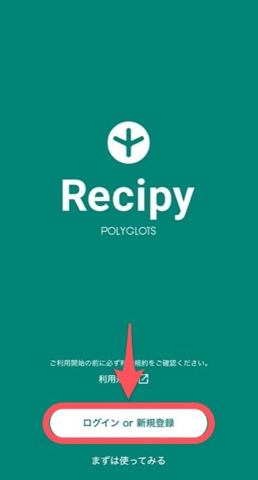 アプリを起動し、「ログイン or 新規登録」ボタンを押す。