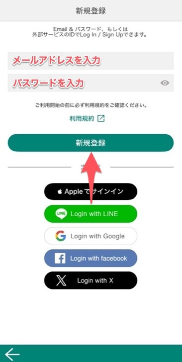 メールアドレスとパスワードを入力し、「新規登録」ボタンを押す。