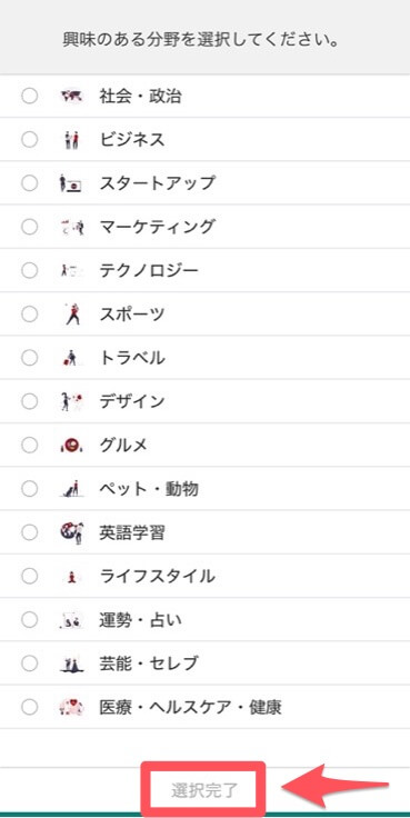 画面に沿ってすべての質問に答え、最後に興味のあるジャンルを選択。