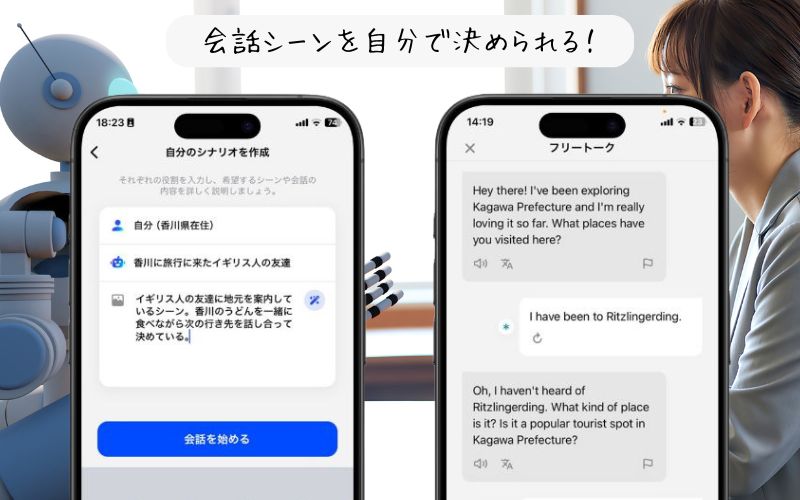 自分とAIの役割、会話シーンを自由に設定できるので、実践的な会話練習が可能です。