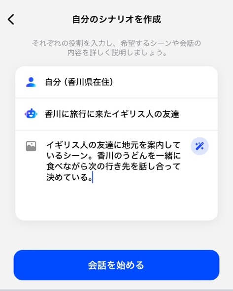 「自分とAIの役割」「会話のシーン・内容」を自由に設定できるから、