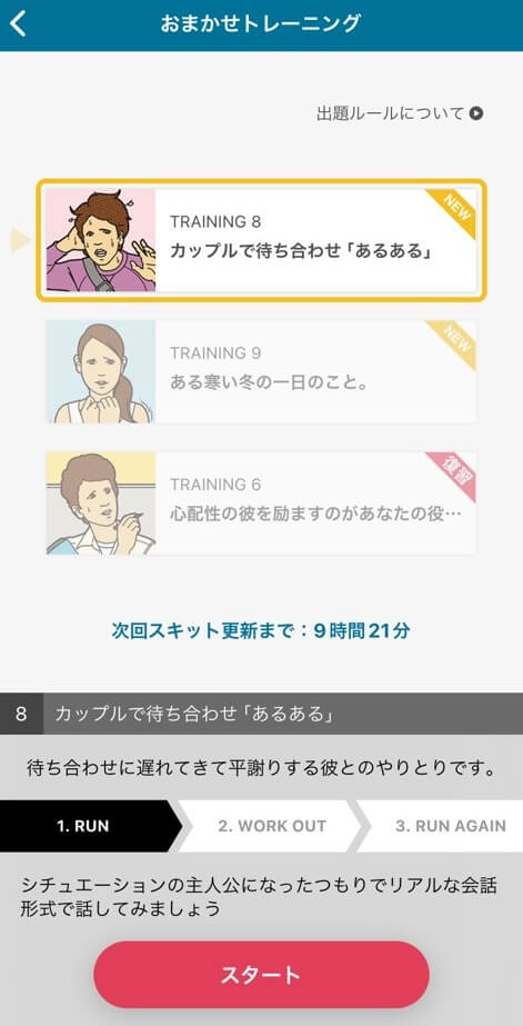 取り組むスキット数・スキットの順番は決まっており、「新規スキット2つ → 復習スキット1つ(ランダム)」の順に進みます。