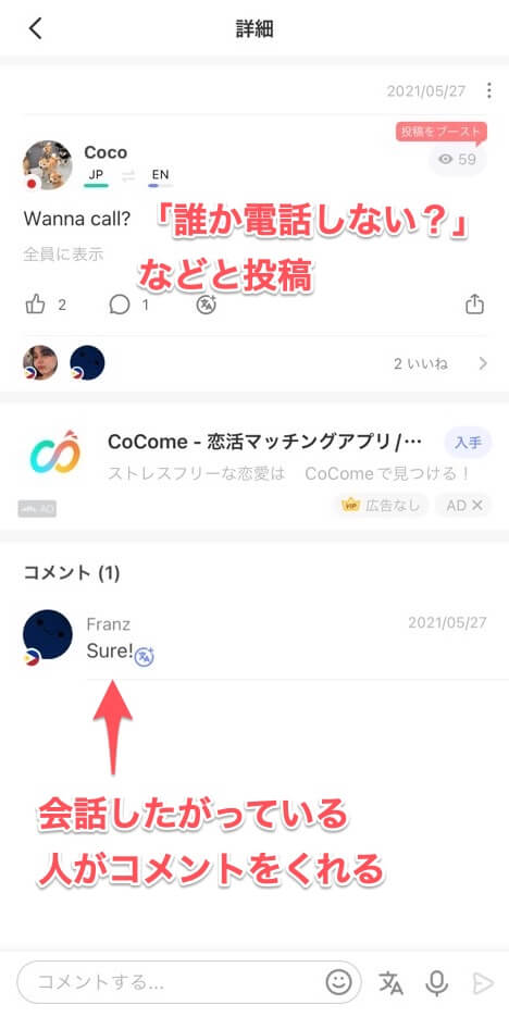 一方でHellotalkなら、タイムライン機能を使うことで、すぐに会話相手を募集できます。